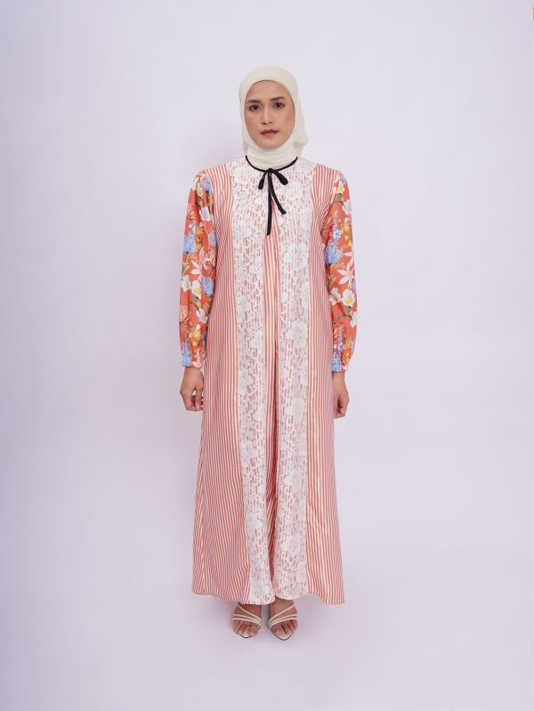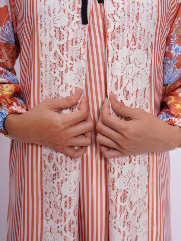 - The dress made of intricate materials, polyester with a floral pattern on the sleeve and lace with stripes cotton on the front.