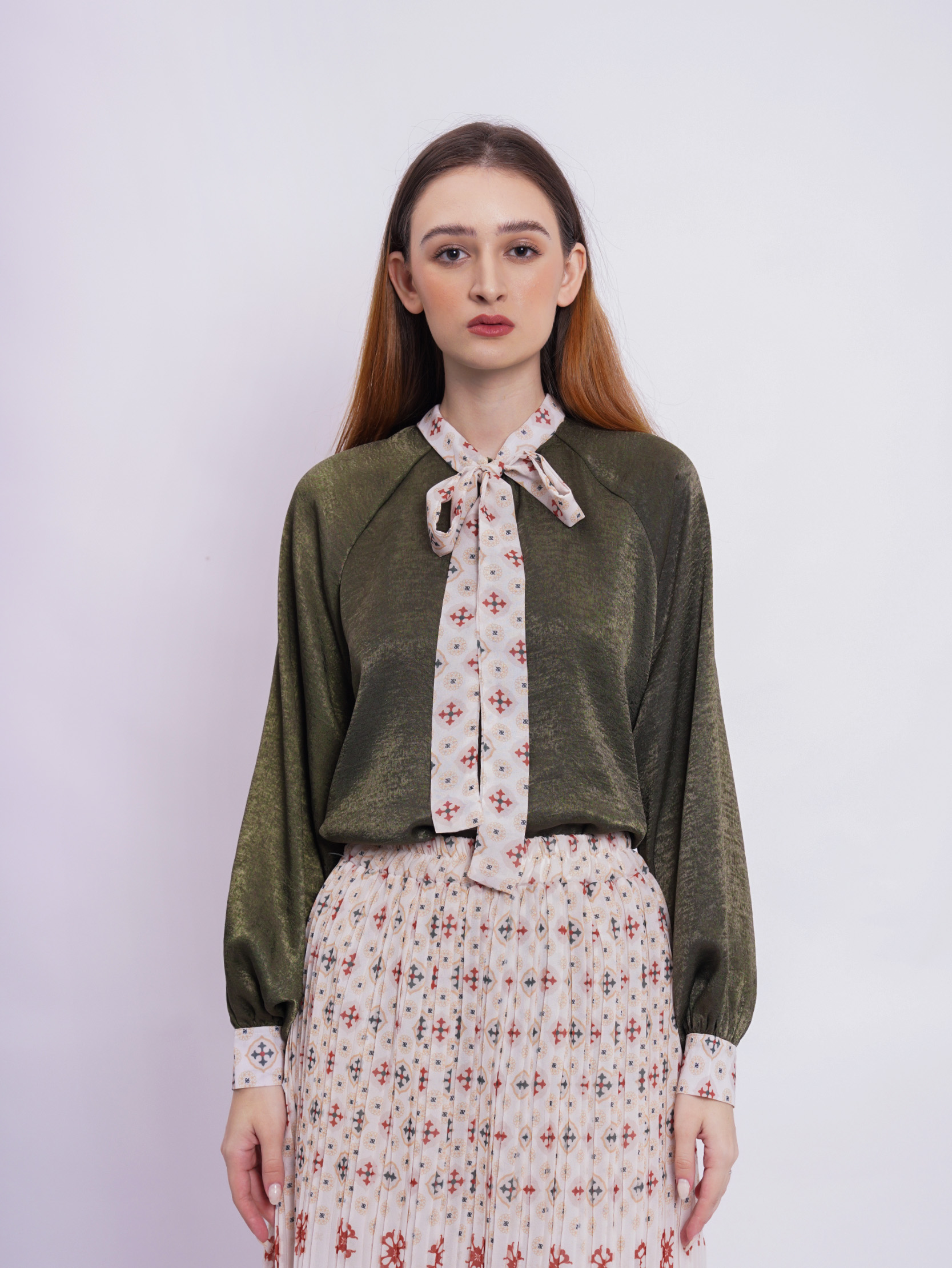 • Soft polyester seamless shirt with elevated pattern mixed combination, gathered details on upper sleeve and adjustable strap to style.
