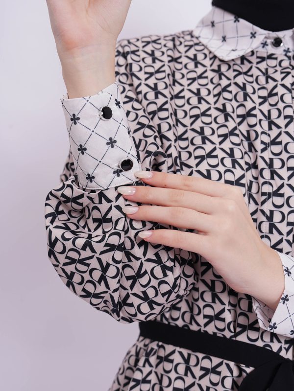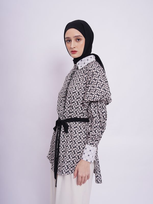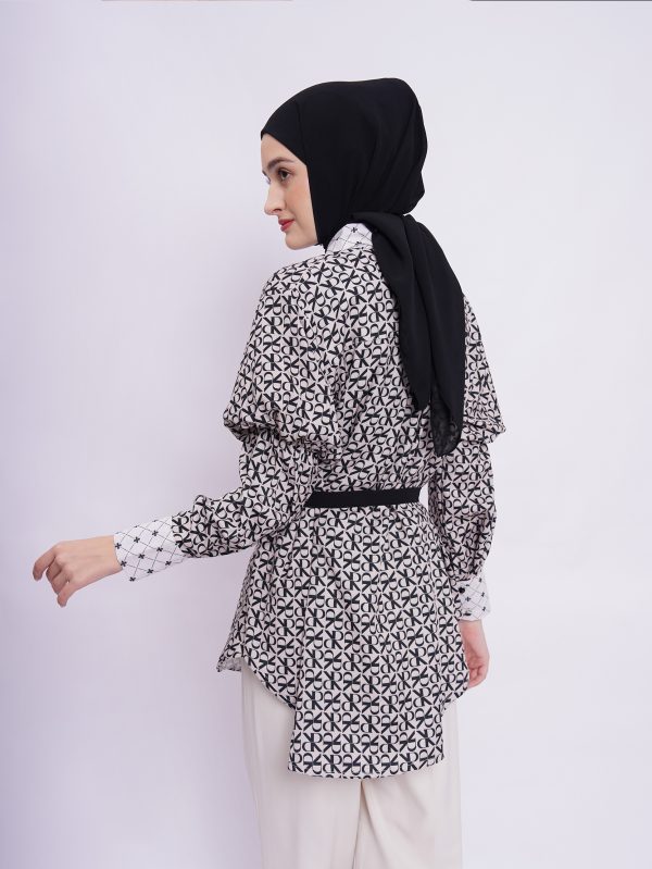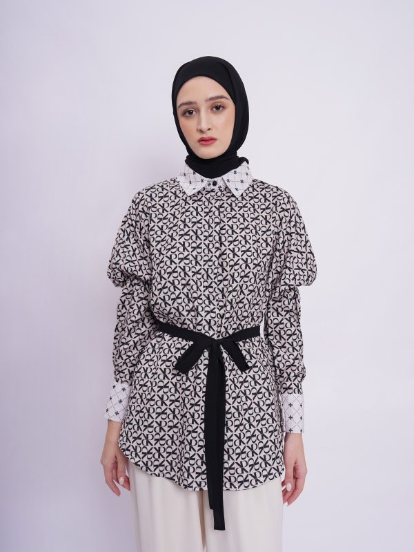 • Soft polyester seamless shirt with elevated pattern mixed combination, gathered details on upper sleeve and adjustable strap to style.