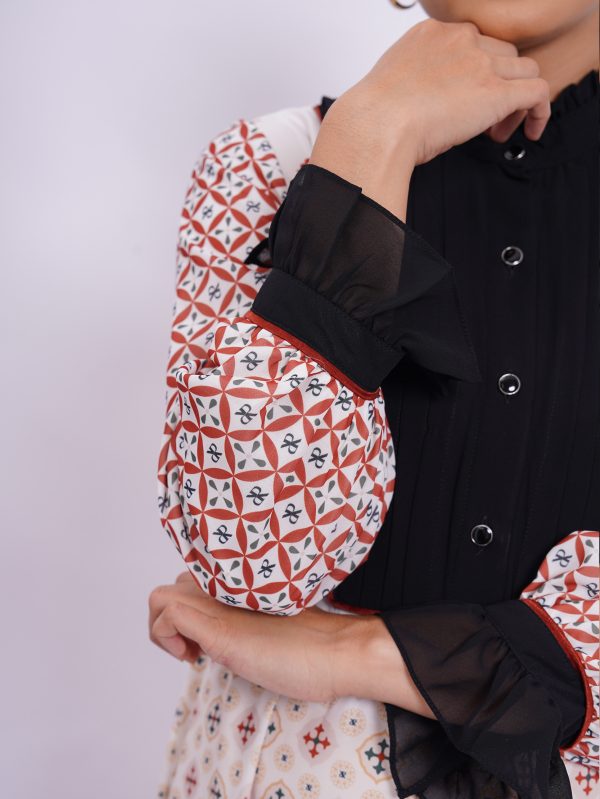 - It comes with a ruffle collar and ruffle at the sleeve ends and complete with pleats on the chest.