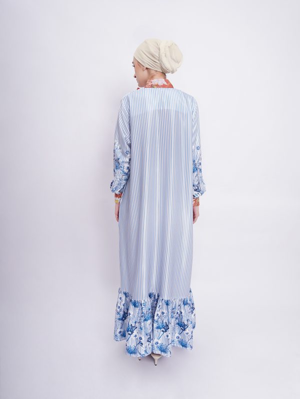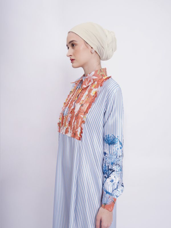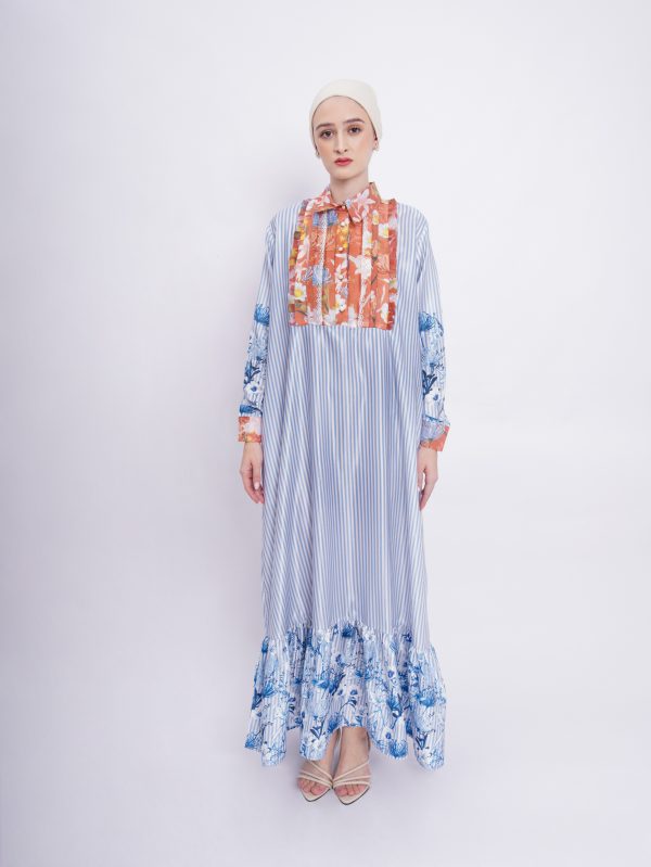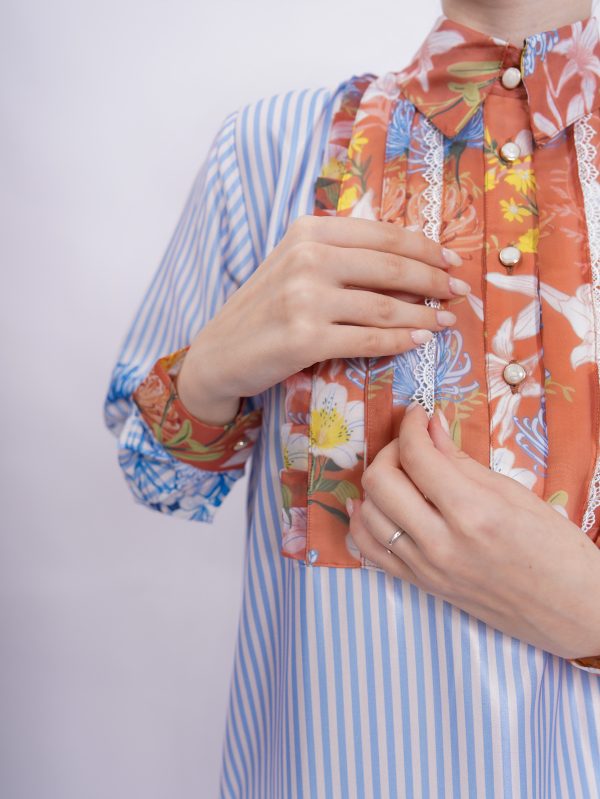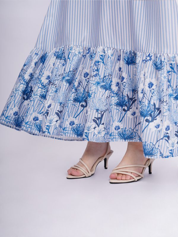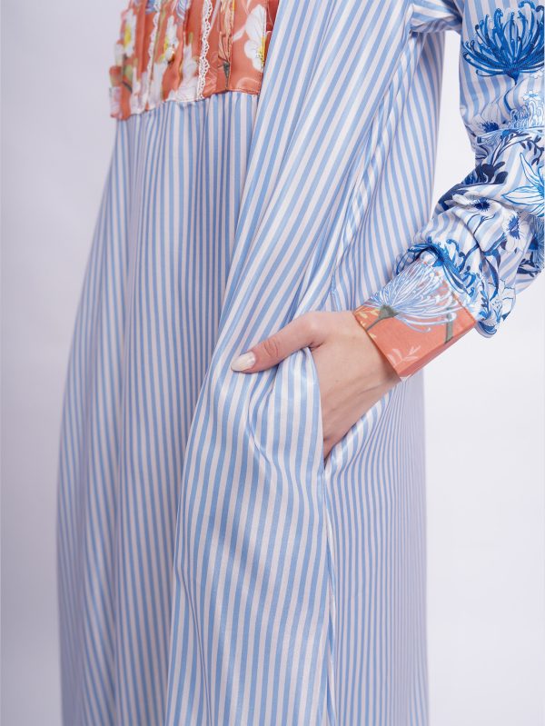 • This charmingly designed dress features a unique blend of mixed stripe and floral patterns.